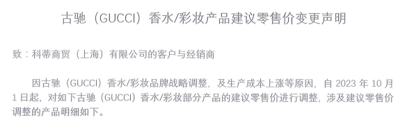 接品牌方通知:科蒂集團(tuán)旗下古馳GUCCI、Burberry、Calvin Klein、Hugo boss、Chloé、Marc Jacobs香水系列……于10月1日正式上調(diào)零售價(jià),本次漲價(jià)幅度不算高,在10元-100元左右,對(duì)于一瓶大牌香水來說,算是在可接受的范圍之內(nèi)。